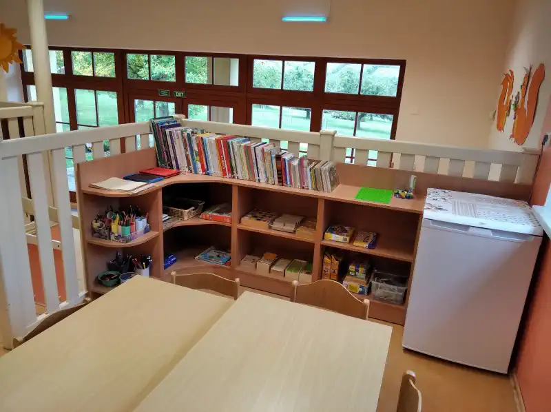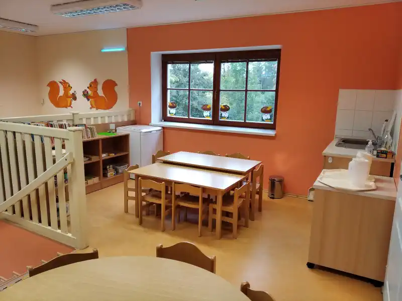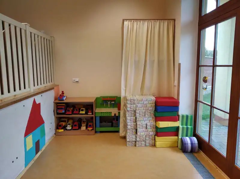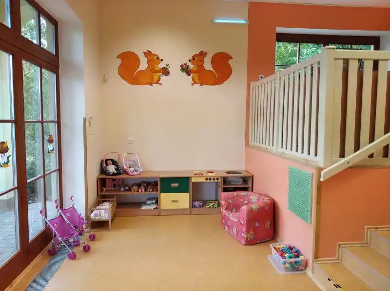 Vnitřní prostory jsou atypicky řešeny. Třída je rozdělena schodištěm na dvě patra – horní a spodní část. Je vybavena dětským nábytkem, k dispozici jsou didaktické pomůcky a vhodné hračky. Jednotlivé hračky a pomůcky jsou umístěny tak, aby na ně děti dosáhly a mohly s nimi bezpečně manipulovat, dále umožňovaly různé individuální a skupinové činnosti.