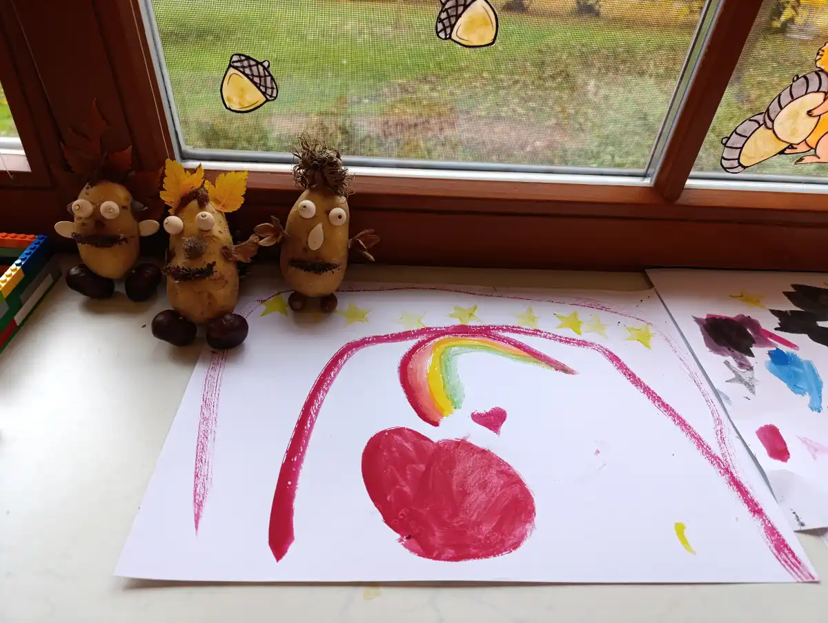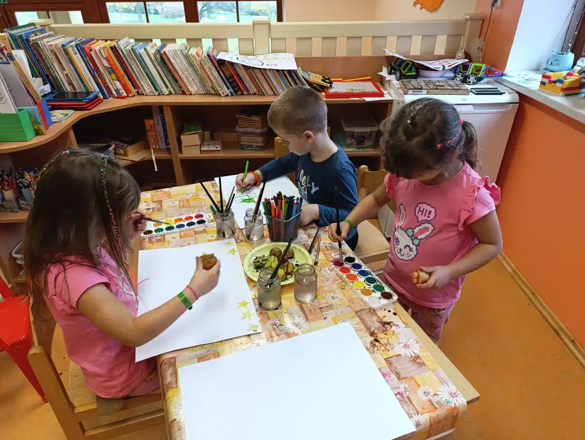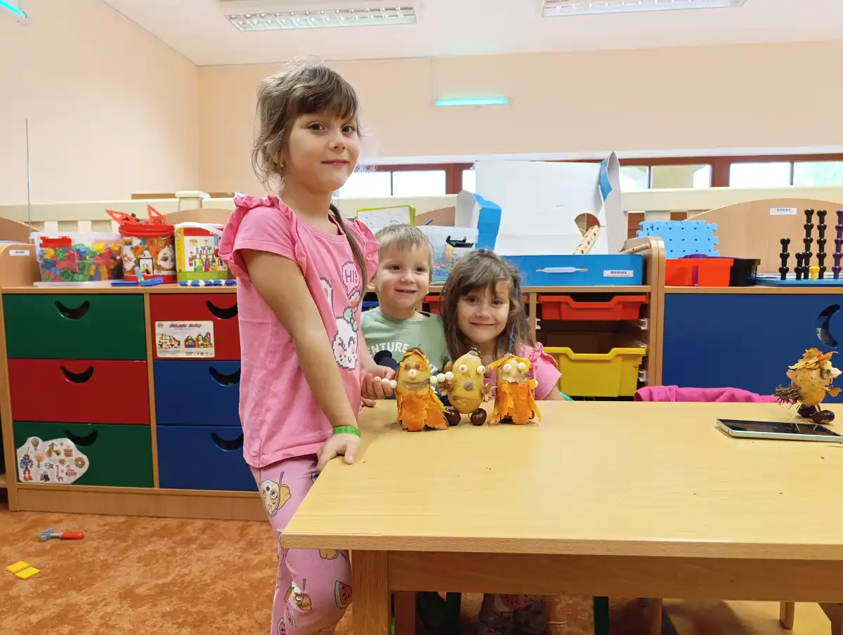 Po společném přivítání na všechny čekaly hned dva náročné úkoly. Prvním z nich bylo vytvořit z brambor, ale i za pomoci dalších přírodnin, bramborového skřítka. Druhým úkolem bylo sestavit připravenými bramborovými tiskátky podzimní obrázek.