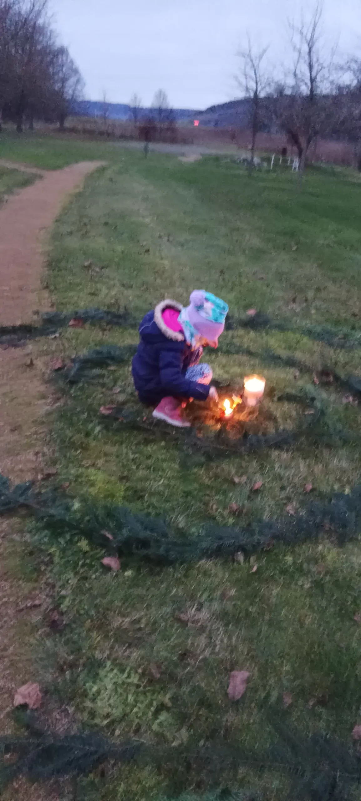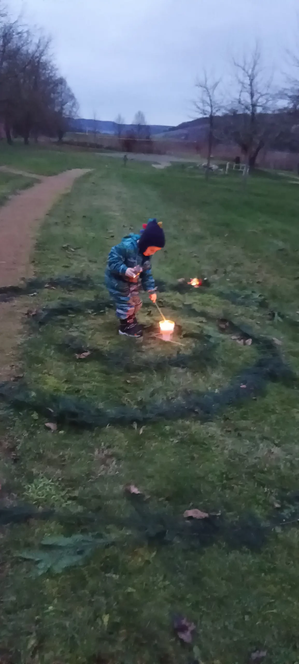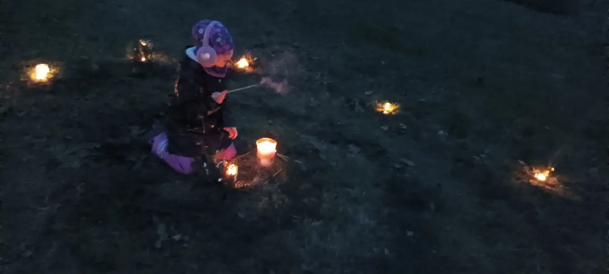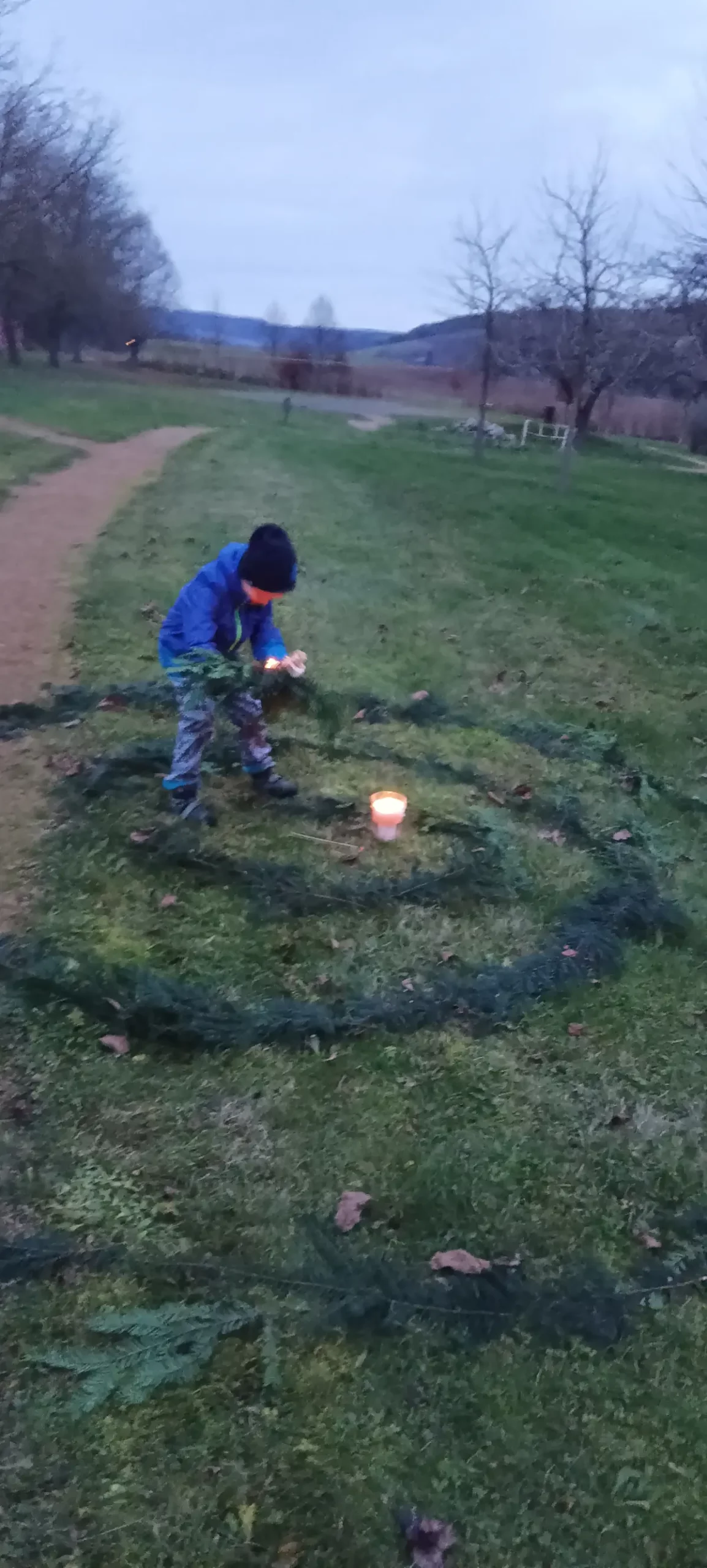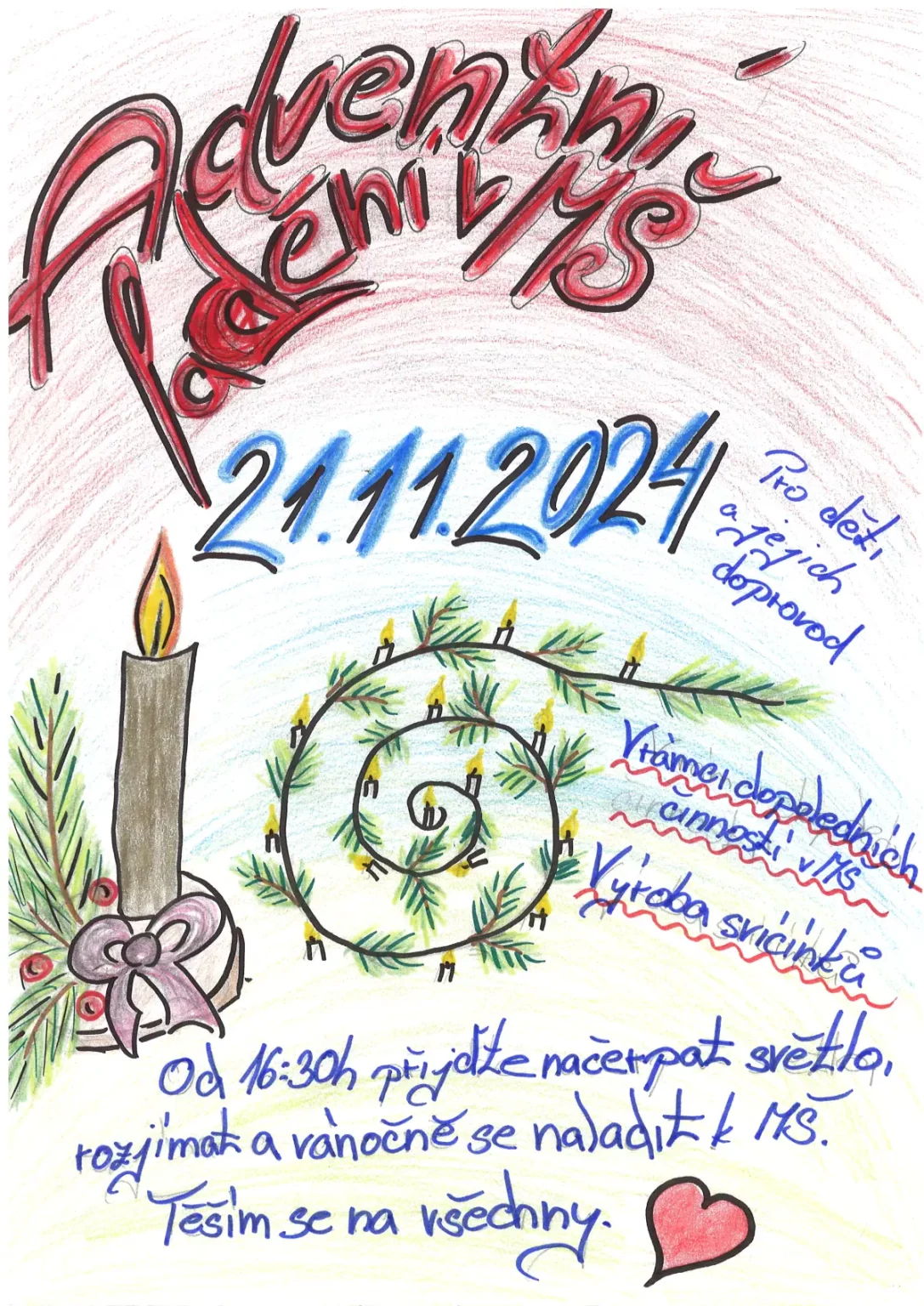 Po sv. Martinovi nastává čas příprav na advent a blížící se Vánoce. Čas očekávání, zklidnění, ale také plný chladných a pochmurných dní. V MŠ jsme si uspořádali adventní ladění, abychom si tyto dny trošku rozsvítili, připravila jsem pro děti adventní spirálu. Během dopoledne jsme společně vyráběli svícínky. Jeden byl klasický z jablíčka a sušeného ovoce a druhý z chvojí na dřevěném podstavci s různými ozdobami. Takto připravené svícny na nás počkaly do odpoledních hodin. Až se přiblížila tma, začali jsme postupně naši spirálu z chvojí rozsvěcet. Každý si pak vzal svůj svícínek a vydal se do středu spirály k velké svíci nabrat si světlo a položit někam na spirálu zapálený svícen. Spirála je o prožitku radosti z přibývajícího vnitřního světla, kterého se nám v této době zvenčí tolik nedostává. Je také o poznávání, že prostřednictvím tiché, klidné a láskyplné činnosti je svět i v pochmurných barvách krásný. Děti a všichni zúčastnění prožili tajemnou atmosféru rostoucího světla, uklidnění, ticha, světla a očekávání. Spirály radosti se zúčastnily nejen děti z MŠ, ale i někteří školáci a jejich doprovod. Chtěla bych moc poděkovat za účast všem a zároveň přeji krásný pohodový blížící se advent.