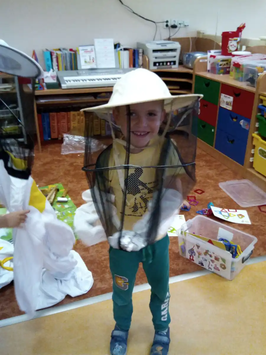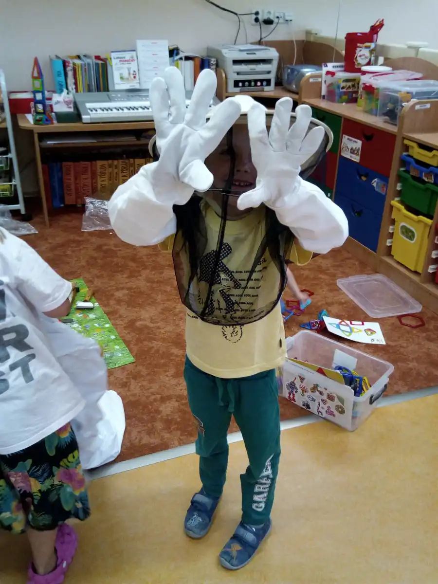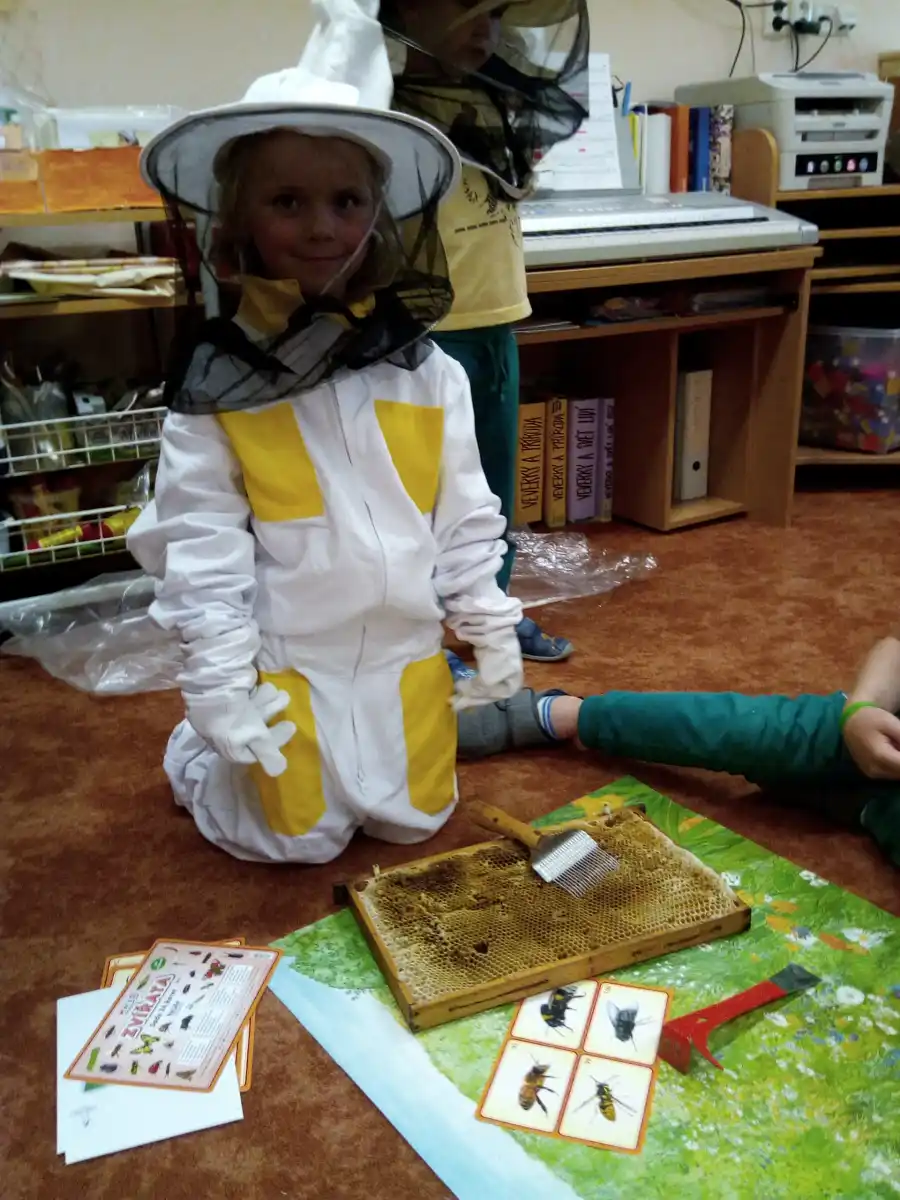 V rámci tématu Život na louce si děti vybraly bližší poznání života včely. V MŠ si tak mohly vyzkoušet včelařský oblek, osahat a prohlédnout spoustu včelařských pomůcek, nástrojů a náčiní. Povídali jsme si o životě včel v úle, proč jsou pro nás včely důležité, a ochutnali jsme med. Děti měly spoustu zvídavých otázek. Dopoledne uteklo jako voda a všichni si ho moc užili.
