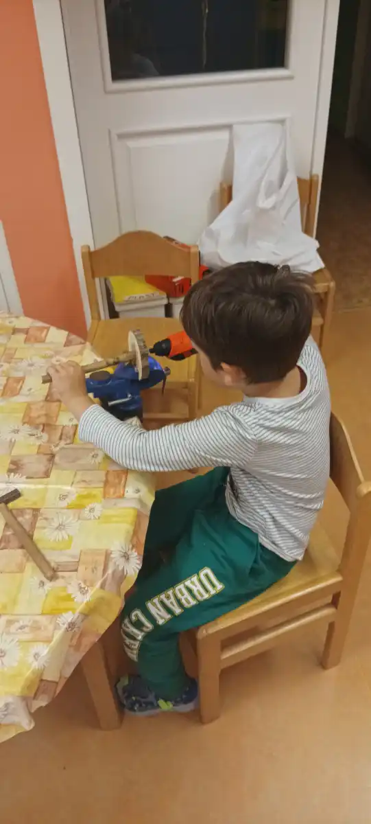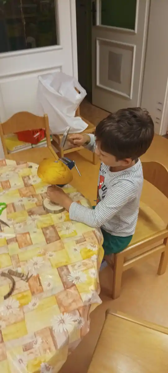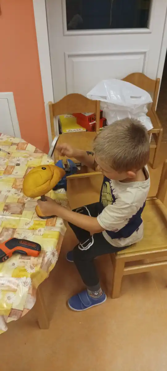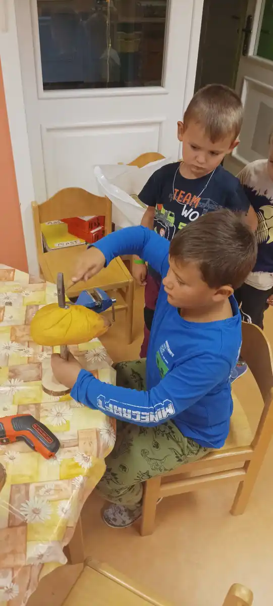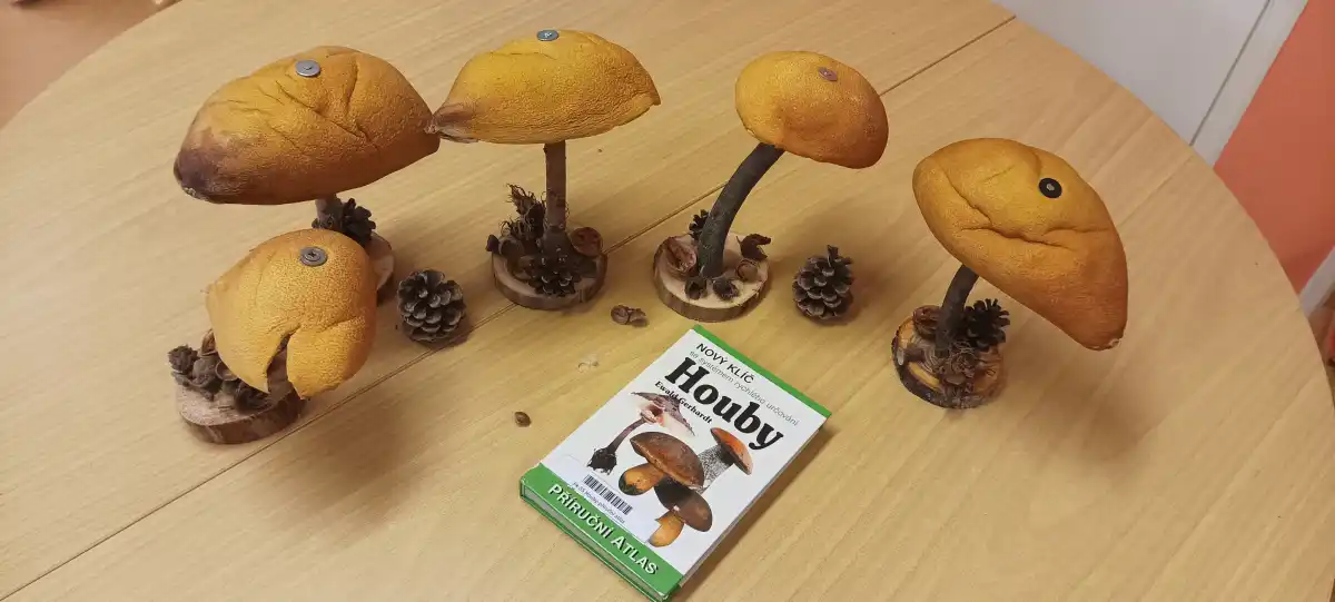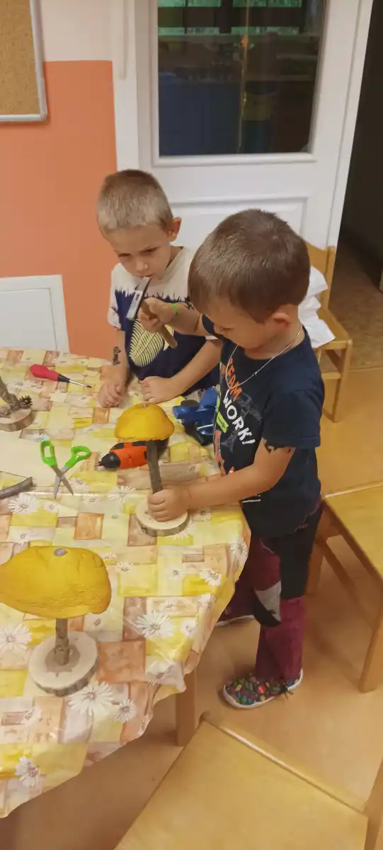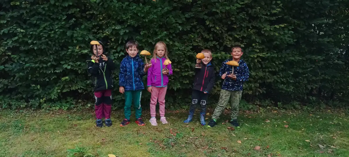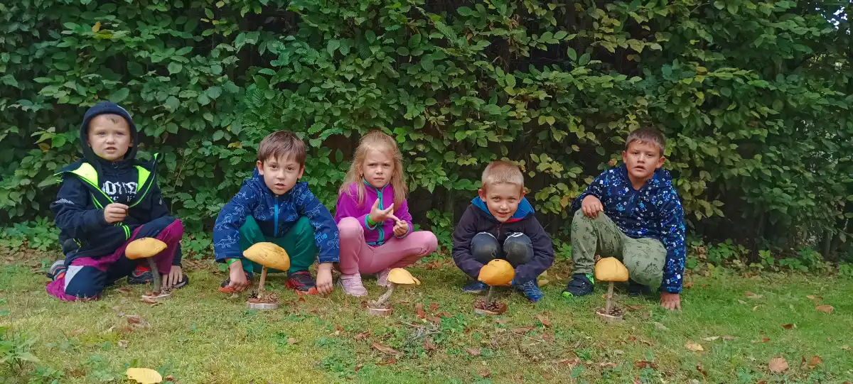 V prvních zářijových dnech jsme s dětmi objevily na našich toulkách parkem první houby, které děti velmi zaujaly. Téma do třídy v MŠ bylo tím pádem jasné. Děti čekal závěr jejich léčebného pobytu u nás a poslední dny jsme věnovali právě houbám. Poznávali jsme je, počítali, třídili, hráli jsme hry, ale nejvíce děti bavilo je vyrábět. Využili jsme naše nářadí k rozvoji polytechnických dovedností a popustili uzdu svojí fantazii. Houby z přírodnin byly tu, a moc se dětem povedly.
