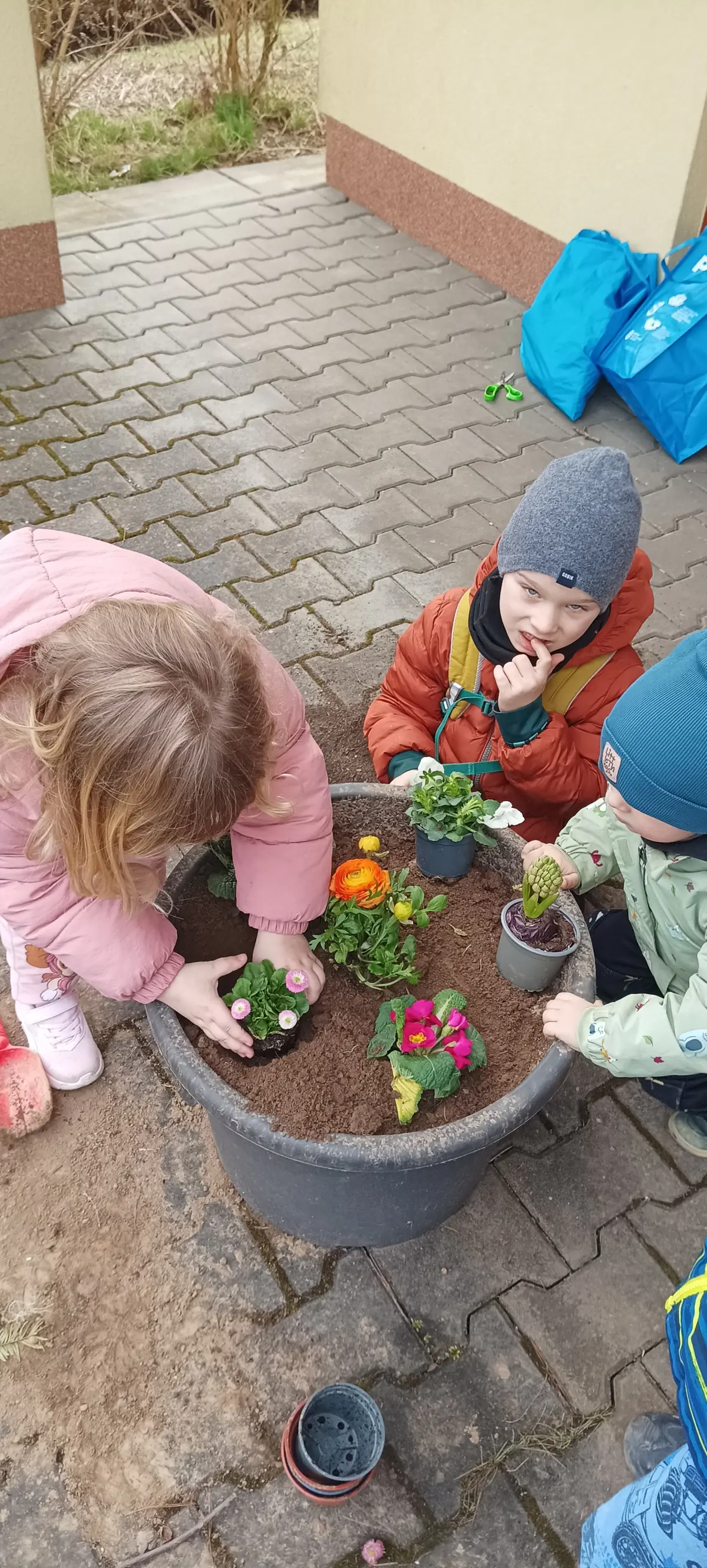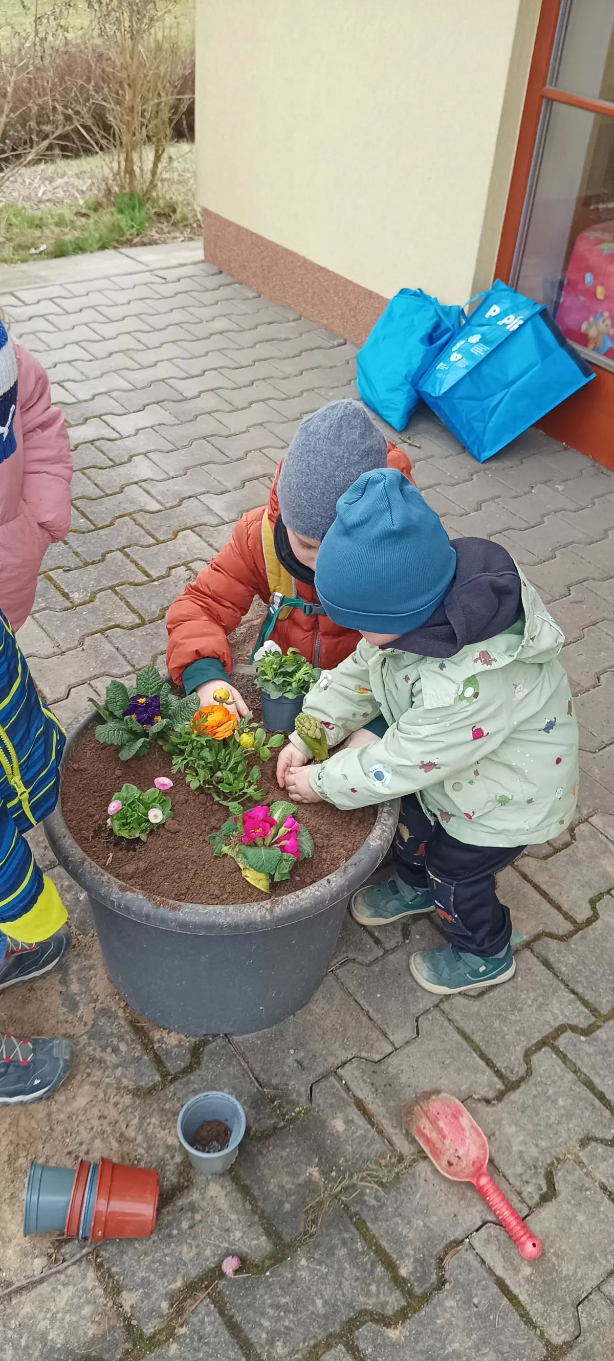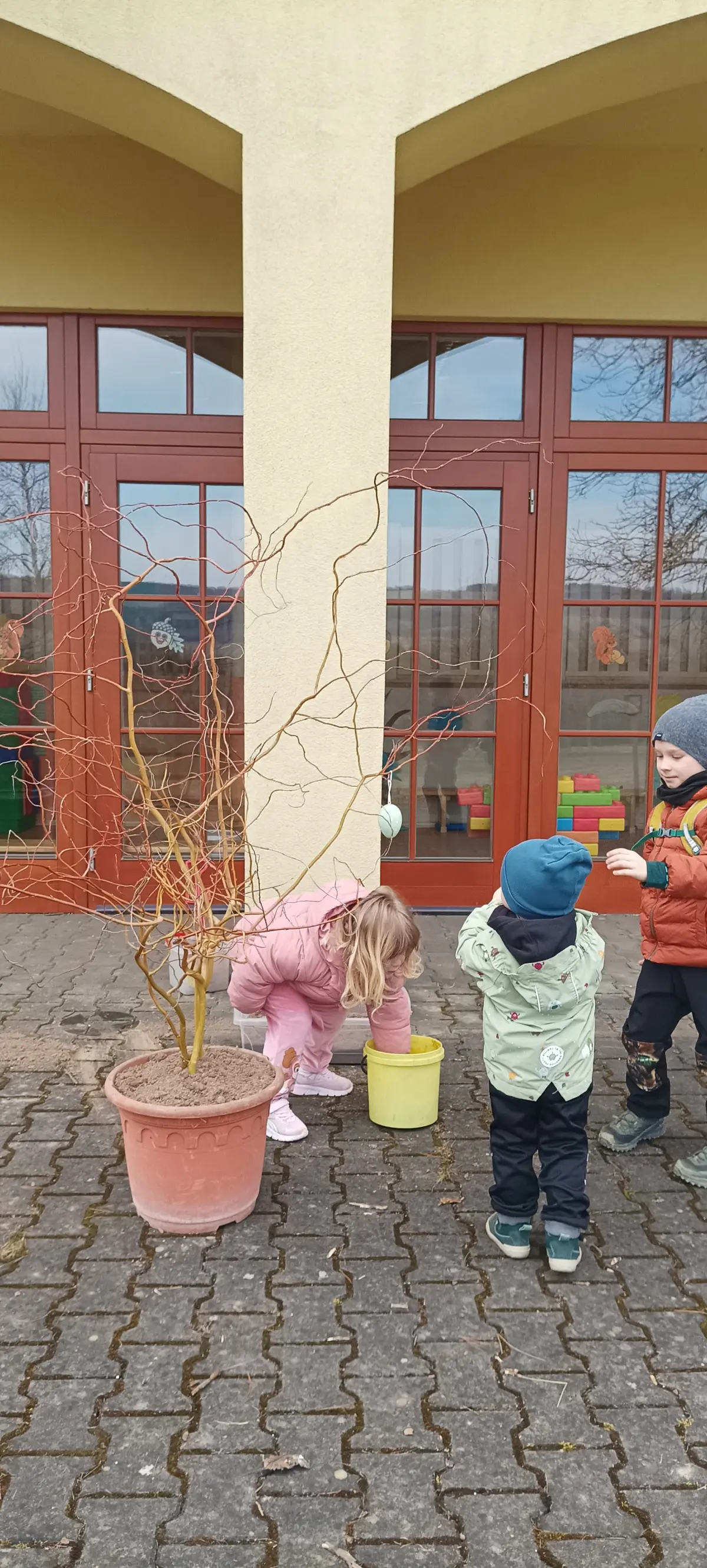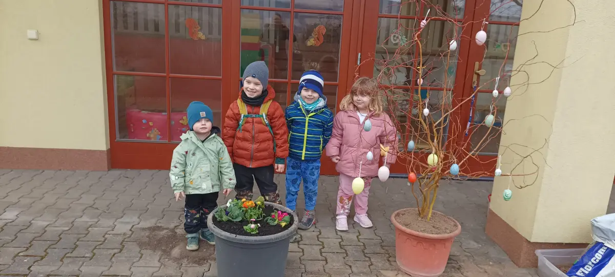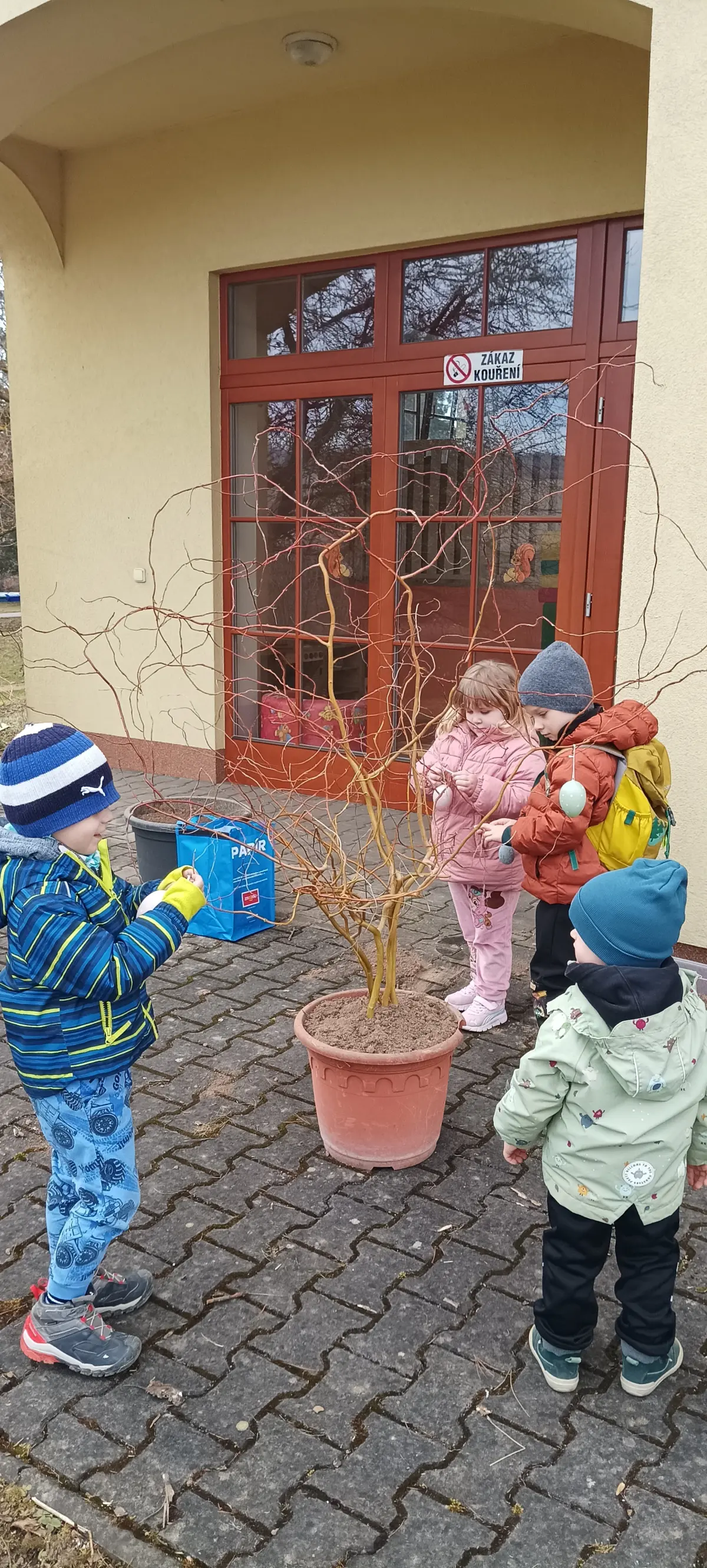 V MŠ jsme přivítali jaro. V posledních dnech si povídáme o jarních květinách, zpíváme, tančíme a učíme se různá rytmická říkadla. Děti, tak symbolicky vyhánějí zimu a vítají jaro. Venku v parku pozorujeme opravdu přicházející jaro v probouzející se přírodě. K příležitosti prvního jarního dne, si děti udělaly výzdobu na terase MŠ. Hlínu do květináčů nabraly v parku z hromádek od krtka. Postupně jsme společně naplnili velké květináče. Proutky z vrby jsme nazdobili vajíčky a do druhého květináče děti zasadily jarní květiny. Z činností měly velkou radost a byla to pro ně zábava.