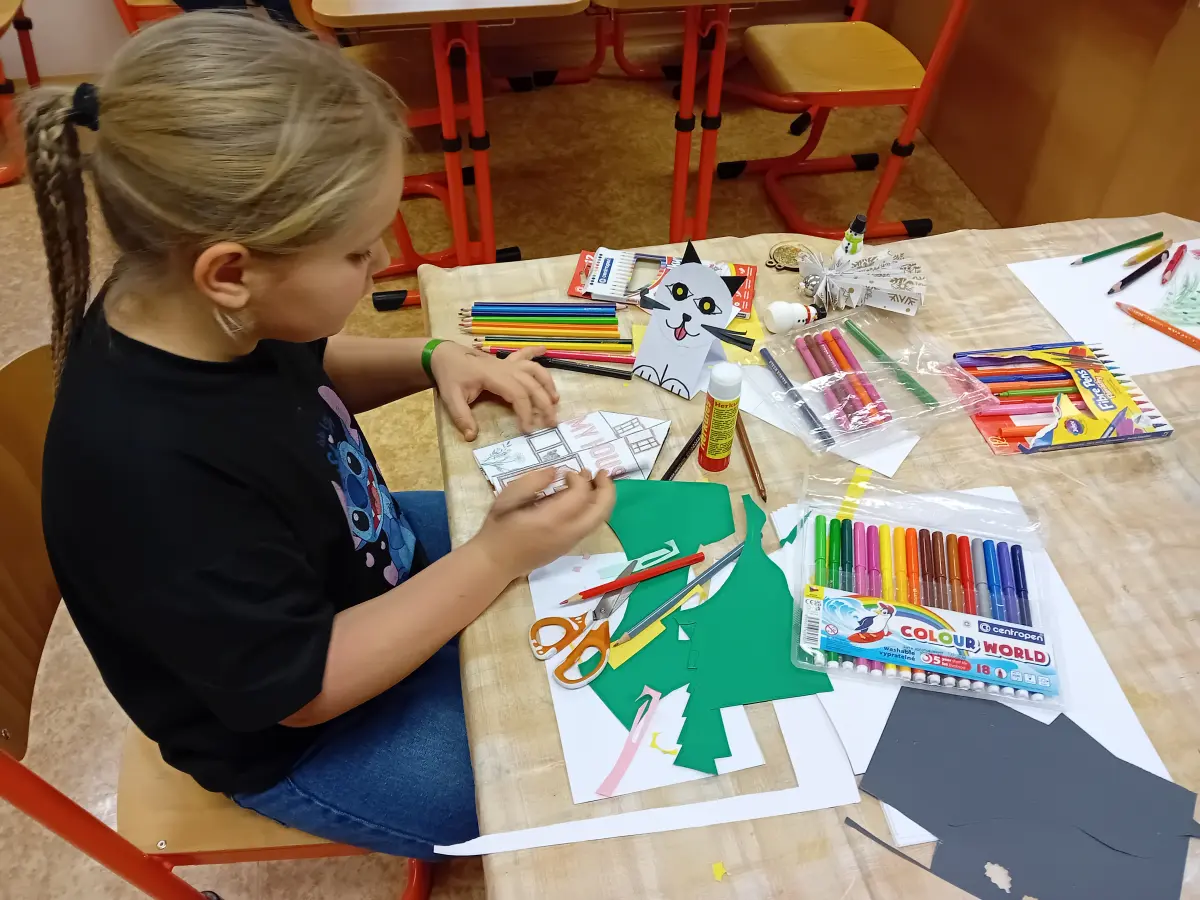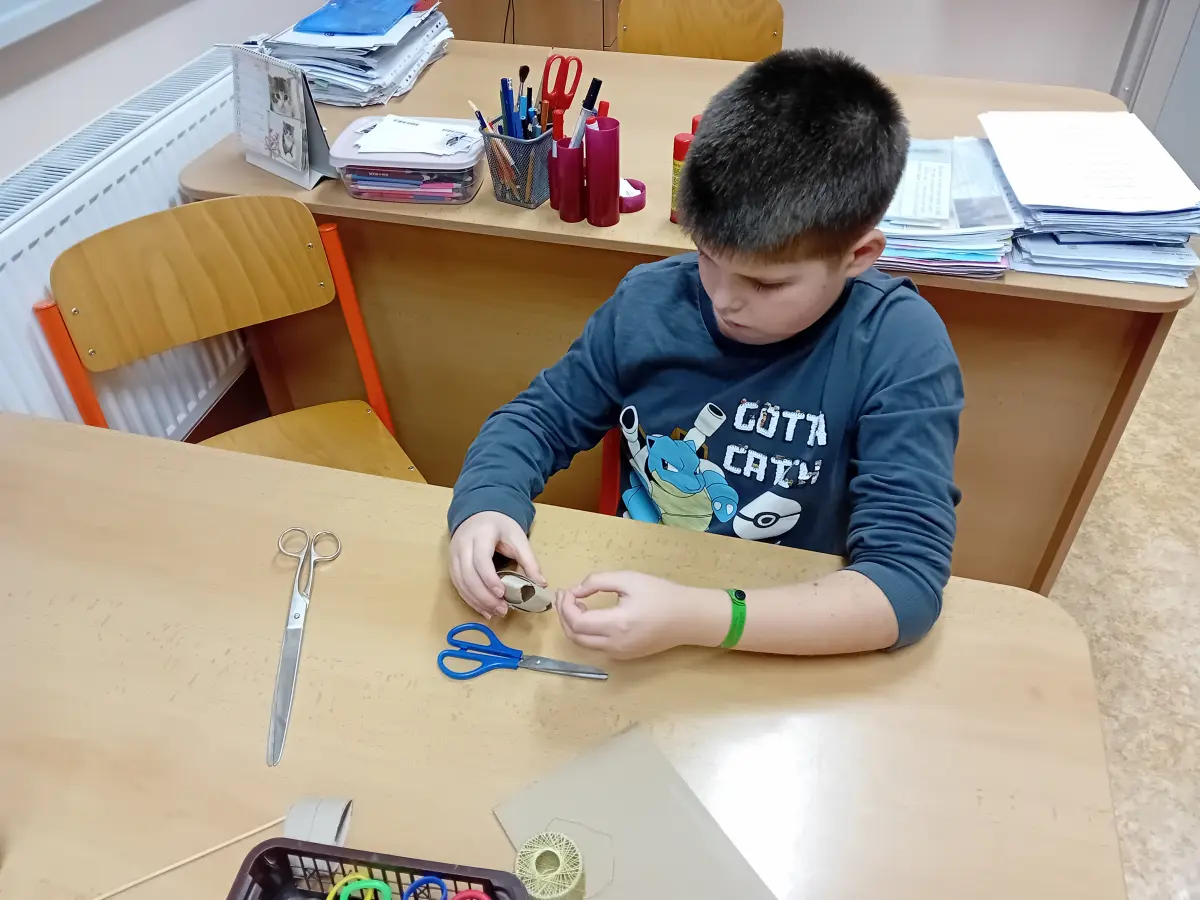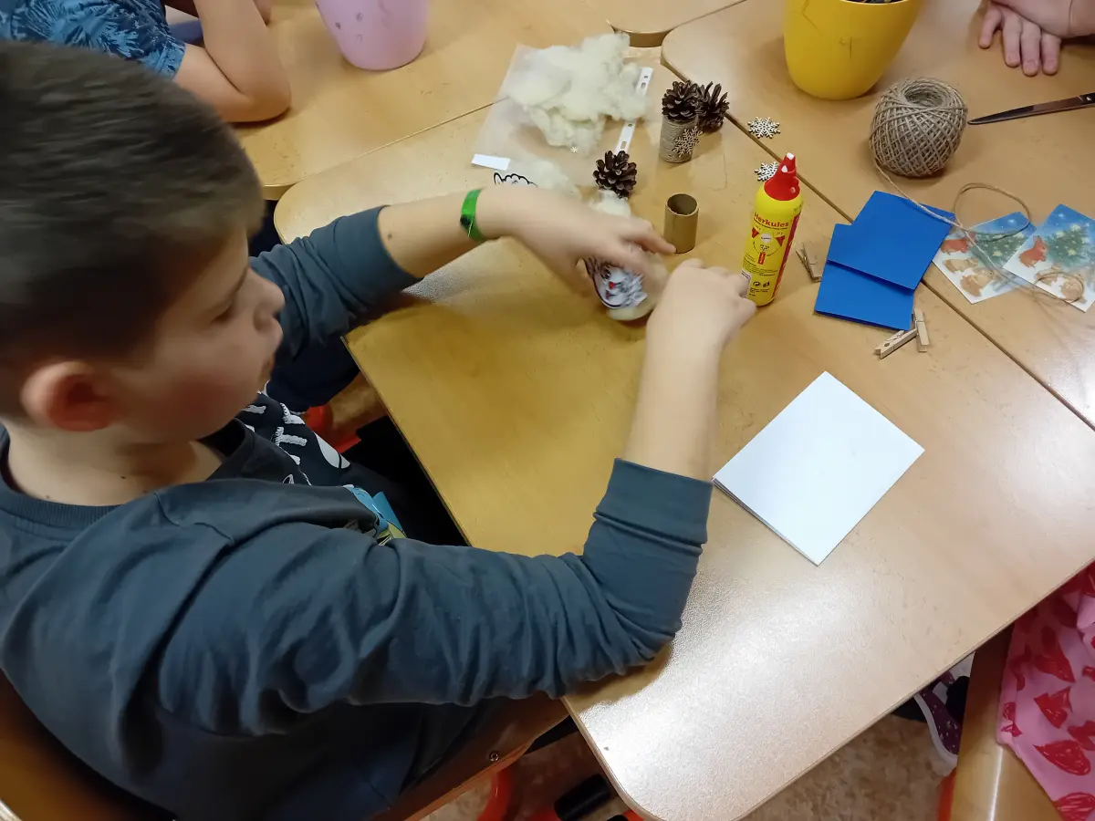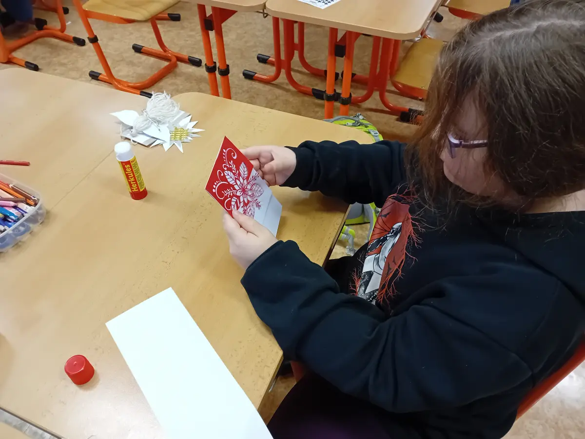 Úterní třetí a čtvrtá vyučovací hodina se proměnily v chvíle, které připomínaly malou ochutnávku Vánoc. Ve třídě panovala příjemná, téměř slavnostní atmosféra – povídalo se o vánočních zvycích, tradicích i drobných příbězích, které k tomuto období patří. Žáci se postupně přesouvali mezi čtyřmi stanovišti, z nichž každé nabízelo jiný druh tvoření. Pracovalo se s papírem, přírodninami i drobnými dekoracemi, takže vznikala pestrá směs originálních výrobků.