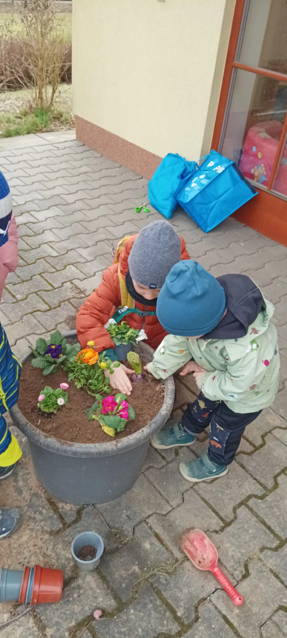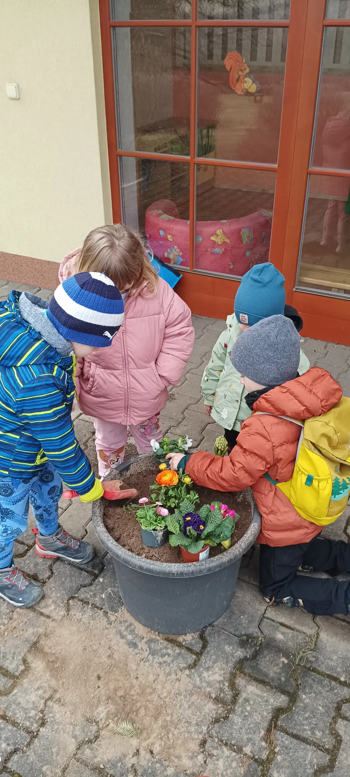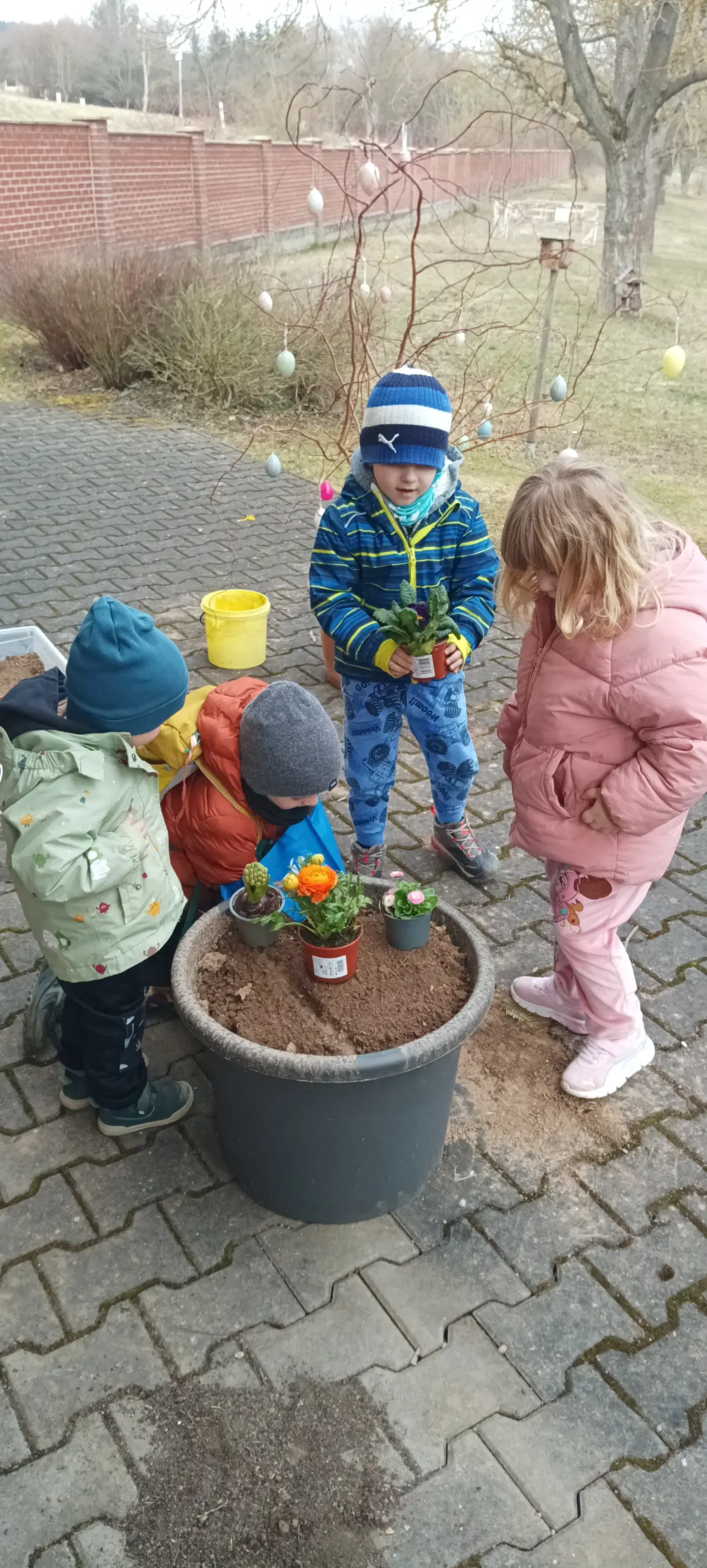V MŠ jsme přivítali jaro. V posledních dnech si povídáme o jarních květinách, zpíváme, tančíme a učíme se různá rytmická říkadla. Děti, tak symbolicky vyhánějí zimu a vítají jaro. Venku v parku pozorujeme opravdu přicházející jaro v probouzející se přírodě. K příležitosti prvního jarního dne, si děti udělaly výzdobu na terase MŠ. Hlínu do květináčů nabraly v parku z hromádek od krtka. Postupně jsme společně naplnili velké květináče. Proutky z vrby jsme nazdobili vajíčky a do druhého květináče děti zasadily jarní květiny. Z činností měly velkou radost a byla to pro ně zábava.